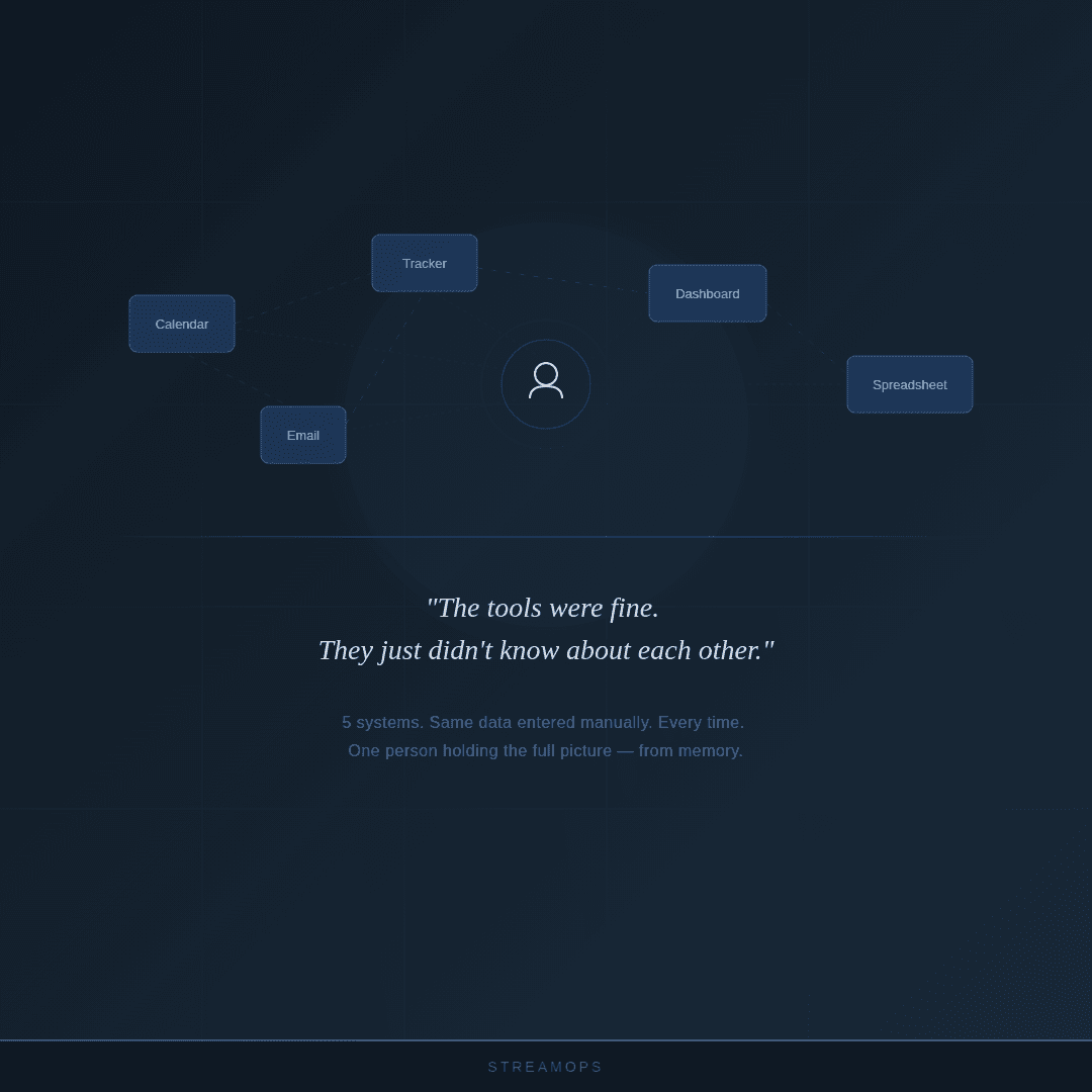 The tools themselves were fine. Calendar, project tracker, dashboard — all doing their jobs. They just weren't connected to each other.
